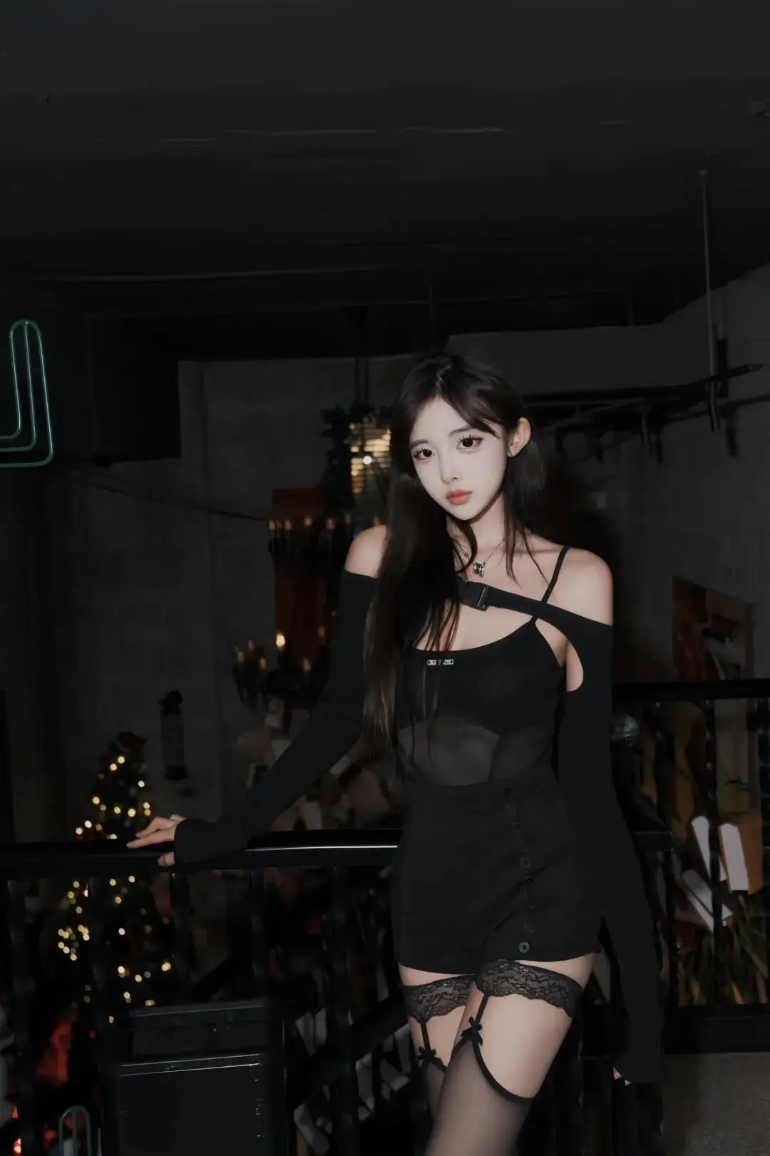 人物单手搭在栏杆上,肩线放松带出随性气场,这是“轻靠松弛感”姿势。平视角度抓准眼神落点,暗调空间里暖光裹住轮廓,衬得露肩黑裙与蕾丝袜更显冷艳。背景里的装饰灯串成了氛围彩蛋,工业风场景和穿搭的性感细节撞出故事感,慵懒里裹着恰到好处的张力
