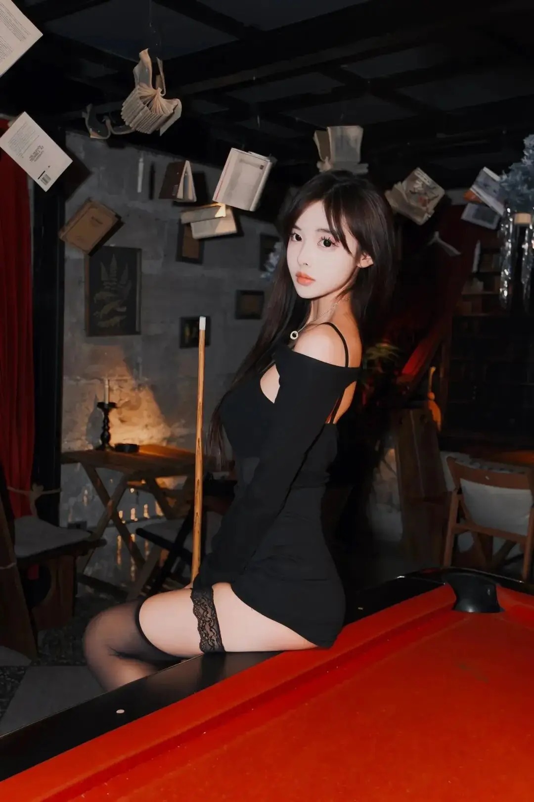 人物侧坐台球桌沿,一手轻握球杆,肩背放松带出随性慵懒——这是“轻倚道具”的氛围感姿势。平视角度抓准眼神落点,暗调空间里暖光裹住轮廓,露肩黑裙配蕾丝袜衬出冷艳质感。悬浮书本、烛台成了复古氛围道具,工业风场景和穿搭撞出故事感,性感里裹着恰到好处的松弛张力