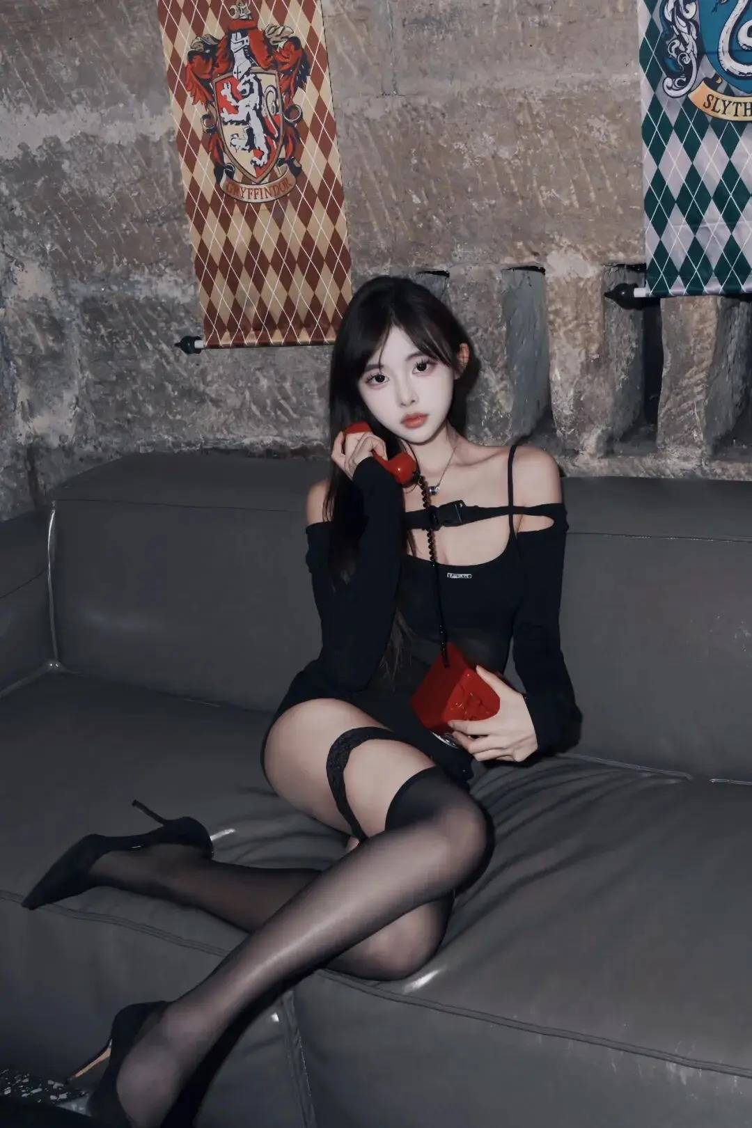 人物斜倚沙发,握红电话的手轻抵下颌,腿线舒展带出身形曲线——这是“道具互动式”松弛姿势。平视角度抓准眼神,暗调里暖光裹住肩颈,露肩黑裙配蕾丝袜衬出冷艳质感。背景学院风挂旗、复古电话成氛围彩蛋,工业风场景和穿搭撞出故事感,性感里裹着慵懒张力,每处细节都踩中情绪片的松弛节奏