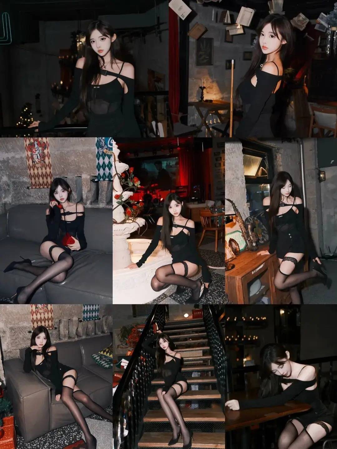 暗调空间里的松弛感,是黑裙与光影的即兴搭戏。露肩褶皱藏着小性感,黑丝衬得脚踝线条更勾人——沙发扶手、台阶转角、吧台边的摆件,都是镜头里的“氛围搭子”。不用硬凹姿态,往那儿一靠,松弛感就裹着冷调滤镜漫出来,每一帧都是自带故事感的情绪片